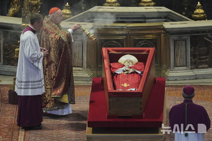 [바티칸시국=AP/뉴시스] 23일(현지 시간) 바티칸의 성 베드로 대성당에서 궁무처장 케빈 조셉 패럴 추기경이 프란치스코 교황의 시신 주위에 향을 뿌리고 있다. 프란치스코 교황의 시신은 사흘간 대성당에 안치돼 일반 신자들의 조문을 받는다. 2025.04.23. |