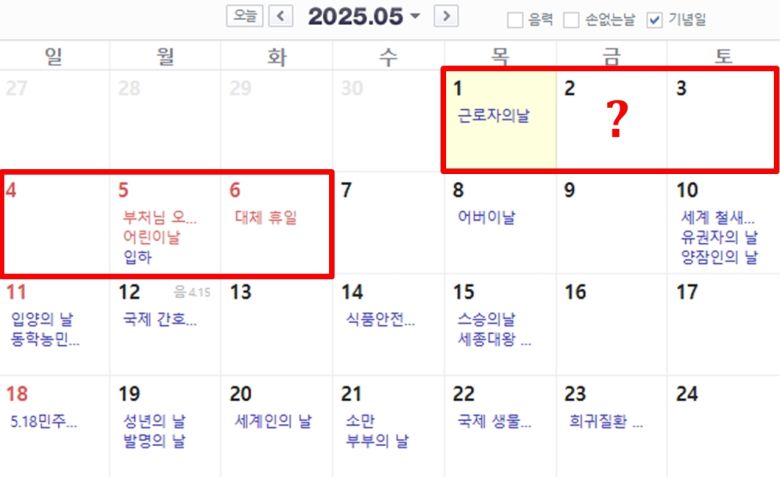 최근 경제계에서는 다음 달 2일이 임시공휴일로 지정되면 5월 1일 근로자의날부터 주말인 3∼4일, 5일 어린이날, 6일 대체공휴일까지 6일간 연휴가 이어질 수 있다는 전망이 제기됐다.