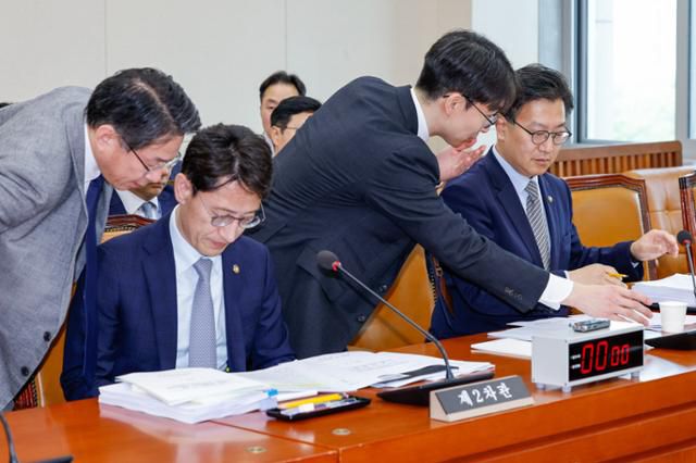 김윤상(왼쪽 두 번째) 기획재정부 2차관, 김범석 1차관(네 번째)이 23일 국회에서 기획재정위원회 제424회국회(임시회) 제1차 전체회의를 준비하고 있다. 뉴스1