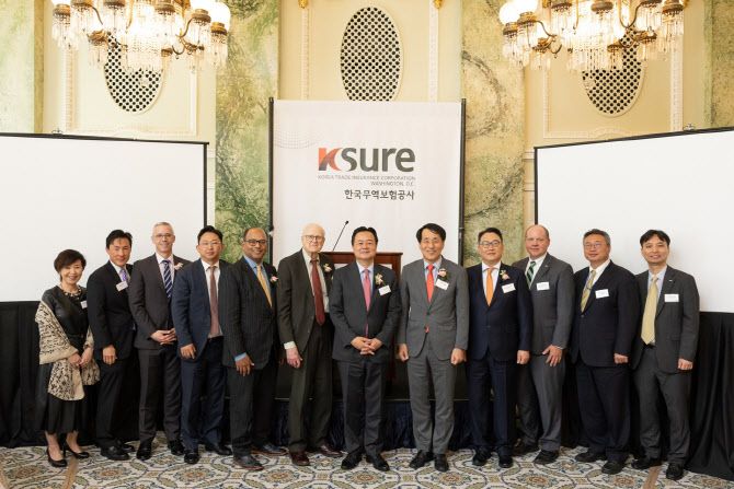 조현동(앞줄 왼쪽 7번째부터) 주미한국대사관 대사와 장영진 한국무역보험공사 사장을 비롯한 관계자가 22일(현지시간) 미국 워싱턴 D.C. 인터컨티넨탈 윌라드 호텔에서 열린 무보 워싱턴지사(지사장 강성훈) 개소식에서 기념촬영하고 있다. (사진=무보)