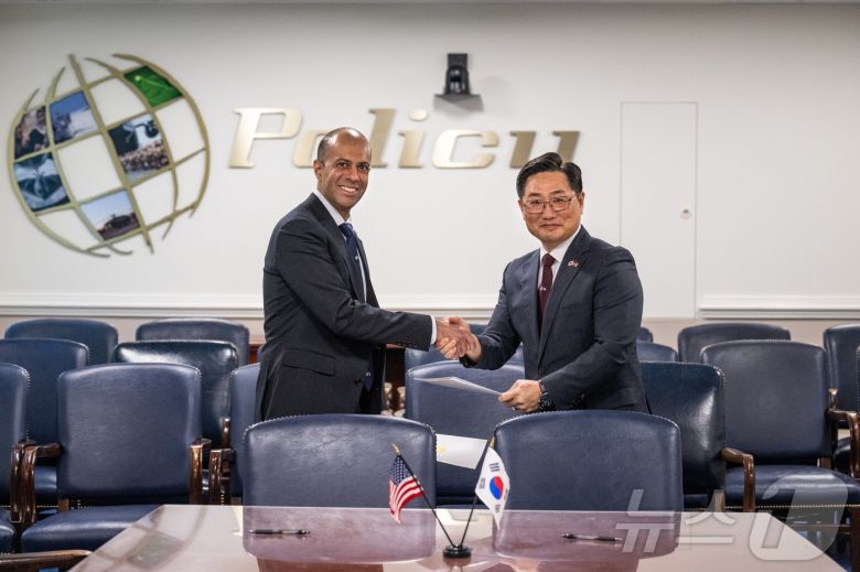 핵협의그룹(NCG) 공동대표인 조창래 국방부 국방정책실장과 비핀 나랑 미 국방부 우주정책차관보가 11일(현지시간) 미국 국방부에서 한미 한반도 핵억제 핵작전 지침에 서명한 뒤 기념 촬영하고 있다. (국방부 제공) 2024.7.12/뉴스1