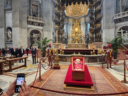 교황의 시신은 바티칸 성 베드로 대성전 한가운데에 자리한 거대한 청동 구조물인 '발다키노' 앞에 안치돼 있었다. 교황청은 1758년 이후 260여년만에 처음으로 대대적인 발다키노 복원 공사에 착수해 지난해 10월 마무리했다.
