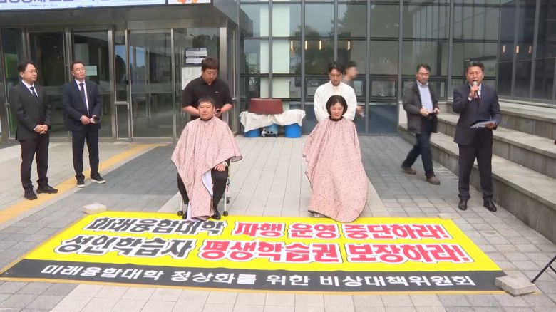 제주대학교 미래융합대학 교수들이 오늘(23일) 오후 산학협력단 1층 입구에서 삭발식을 열고, 성인학습자의 평생학습권 보장과 대학 정상화를 촉구했습니다.