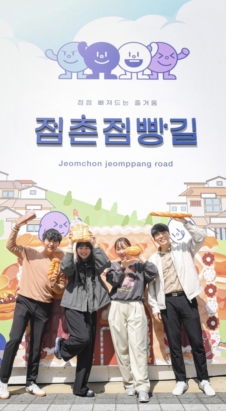 23일 경북 문경시 점촌점빵길 포토존에서 ‘제1회 점촌점빵길 축제’ 홍보에 나선 지역 청년들이 빵을 들고 미소짓고 있다. 문경시 제공
