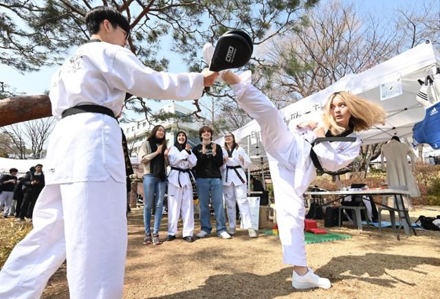 포근한 날씨를 보인 11일 경기도 수원시 아주대학교에서 열린 동아리 박람회에서 외국인 유학생이 태권도 발차기 체험을 하고 있다. 사진은 해당 칼럼과 관계 없음. 뉴시스포근한 날씨를 보인 11일 경기도 수원시 아주대학교에서 열린 동아리 박람회에서 외국인 유학생이 태권도 발차기 체험을 하고 있다. 사진은 해당 칼럼과 관계 없음. 뉴시스 |