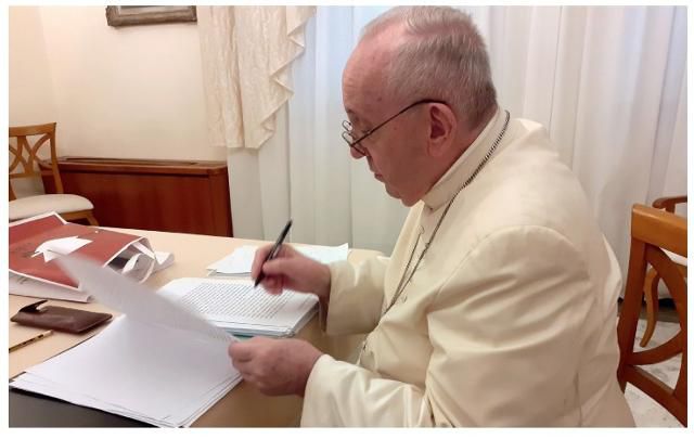 프란치스코 교황이 2020년 7월 자서전 '희망'의 원고마다 사인을 하고 있다. 가톨릭출판사 제공 |
