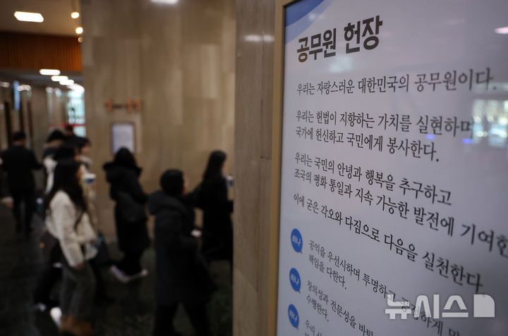 [서울=뉴시스] 배훈식 기자 = 지난 2월 3일 오후 서울 종로구 정부서울청사 로비에 걸린 공무원 헌장 아래로 공무원들이 걸어가고 있다. 2025.02.03. dahora83@newsis.com |