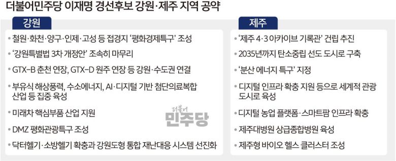 이 후보는 이날 사회관계망서비스(SNS)를 통해 강원·제주 지역을 겨냥한 공약도 발표했다. 강원 지역 공약의 키워드로 ‘미래산업’과 ‘글로벌관광’을 제시했고, 제주 지역 공약으로는 탄소중립 발전을 전면에 내세웠다. 두 지역 경선 결과는 오는 27일 수도권과 함께 민주당 경선 과정의 마지막 일정에서 발표된다.