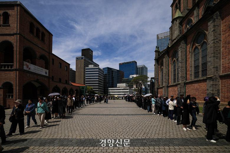 23일 서울 명동대성당에 마련된 프란치스코 교황 빈소를 찾은 신도와 시민들이 조문을 기다리고 있다. 2025.4.23 이준헌 기자