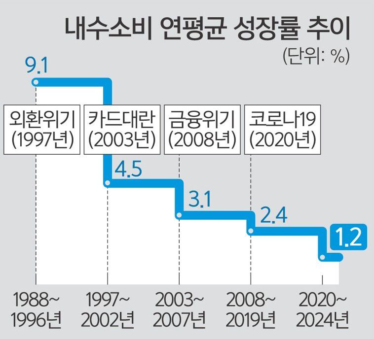 1990년대 9%대씩 성장했던 한국의 내수가 2020년대 들어 1%대로 주저앉아 장기 하락 추세로 접어들었다는 분석이 나왔다. 인구·고용·산업 등 구조적 요인이 쌓여 내수가 살아나지 못하고 있는 것으로 나타났다. 글로벌 보호무역주의가 확산하는 상황에서 내수 기반이 없으면 대외 변수에 취약하기에 장·단기 부양책이 시급하다는 지적이다.