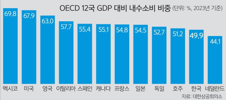 그 결과 한국의 내수소비 비중은 2023년 기준 경제협력개발기구(OECD) 38개국 중 28위이다. 경제 규모가 1조달러를 넘는 12개 국가 중에서는 11위다. 경제 규모가 커지면 GDP·내수 모두 상승 곡선이 완만해질 수밖에 없지만 민간 소비 증가율이 GDP 증가율을 밑도는 것이 문제다. 내수가 부진하다 보니 지난해 내수가 국내 경제 성장에 기여한 정도도 주요국 중 최하위였다. 더불어민주당 임광현 의원이 한국은행에서 제출받은 자료에 따르면, 지난해 실질GDP 성장률 잠정치 2.0% 중 내수의 성장 기여도는 0.1%포인트로 집계됐다. OECD 회원국 중 자료가 공개된 10개국의 내수 기여도는 평균 1.6%포인트로 한국과 차이가 컸다.