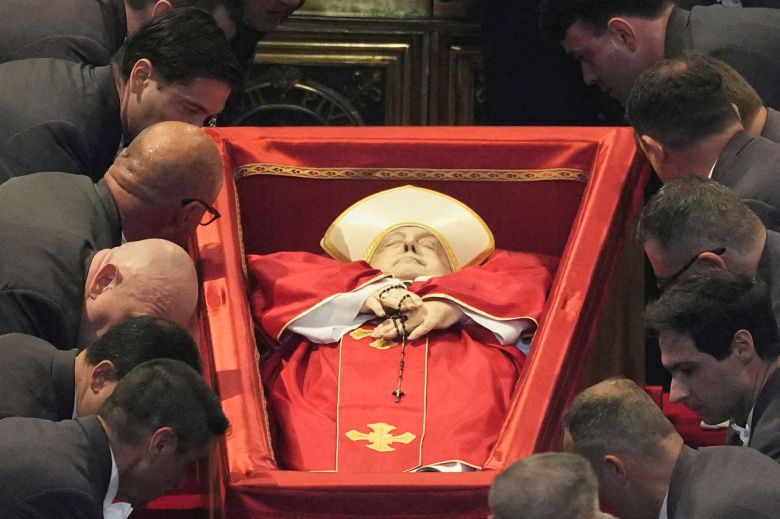 붉은색 제의를 입고 흰색 주교관을 쓴 교황의 시신은 이날 오전 9시 생전 거처였던 산타 마르타의 집에서 성 베드로 대성전으로 옮겨졌다.