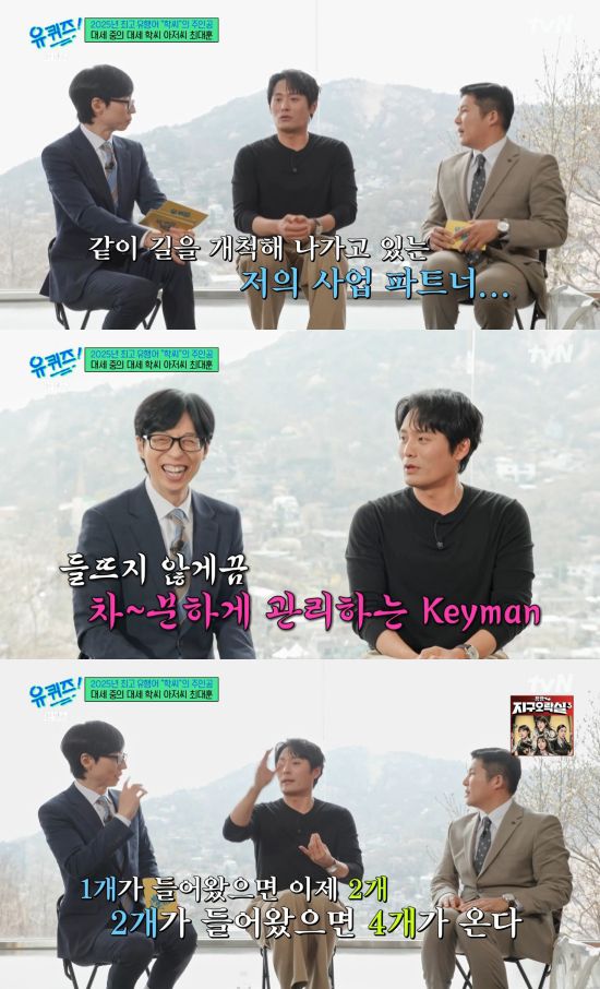 조세호는 "실례가 안 된다면 어떤 제품인지"라며 거들었고, 최대훈은 "제가 말씀드리고 싶은데 저와 같이 길을 개척해 나가고 있는 저희 사업 파트너 키맨 부사장님께서도 확실해지면 이야기하겠다. 늘 그런 패턴이었다. 저도 중간에 묻지 않고 메이드가 되면. 들뜨지 않게끔 차분하게 저를 관리한다"라며 털어놨다.