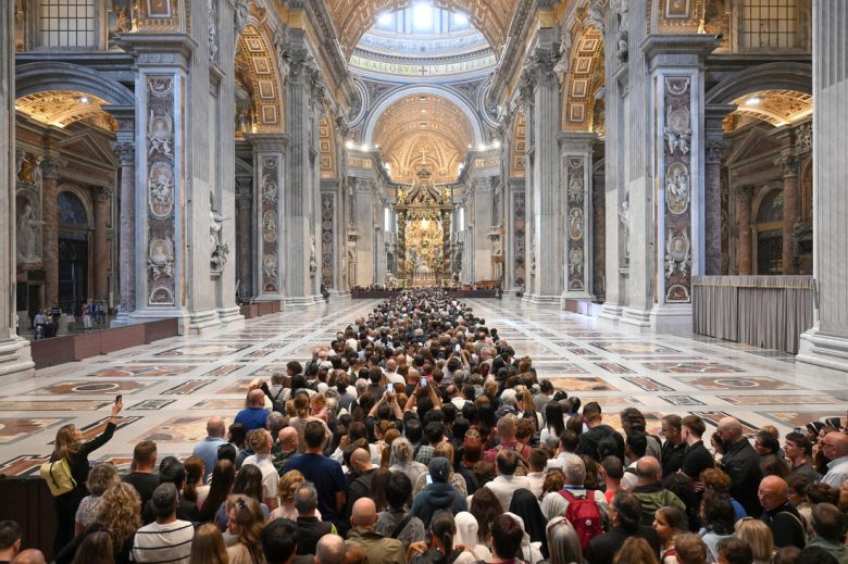 조문객들은 희년(교회가 선포하는 은총의 해)에만 개방하는 성 베드로 대성전의 다섯 청동문 중 맨 오른쪽 성문(聖門·포르타 산타)으로 입장한 뒤 중앙 통로를 따라 이동했다. 조문객들은 프란치스코 교황의 관 앞에서 성호를 긋고 짧은 기도를 올렸다. 휴대전화로 촬영한 교황의 마지막 모습을 간직하려는 이들도 많았다.
