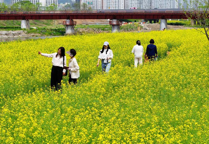 전남 화순 꽃강길에서 시민들이 유채꽃 사이를 거닐며 봄을 만끽하고 있다. 연합뉴스