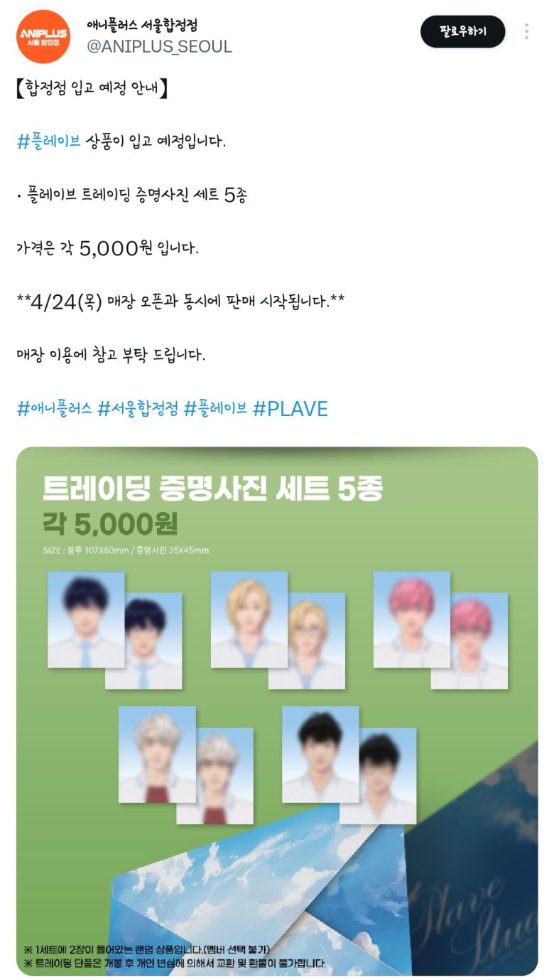 애니메이션 굿즈 판매 직영샵인 애니플러스 서울합정점에서 그룹 '플레이브 트레이딩 증명사진 세트 5종'을 24일부터 판매한다.