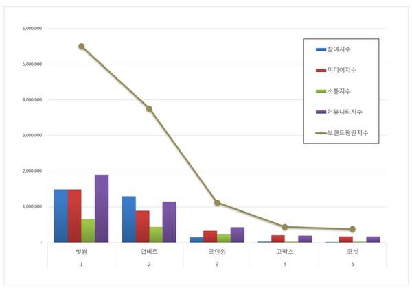 5위, 코빗 브랜드는 참여지수 18,400 미디어지수 167,100 소통지수 26,176 커뮤니티지수 165,128이 되면서 브랜드평판지수 376,804로 분석됐다. 지난 3월 브랜드평판지수 446,428과 비교해보면 15.60% 하락했다.​