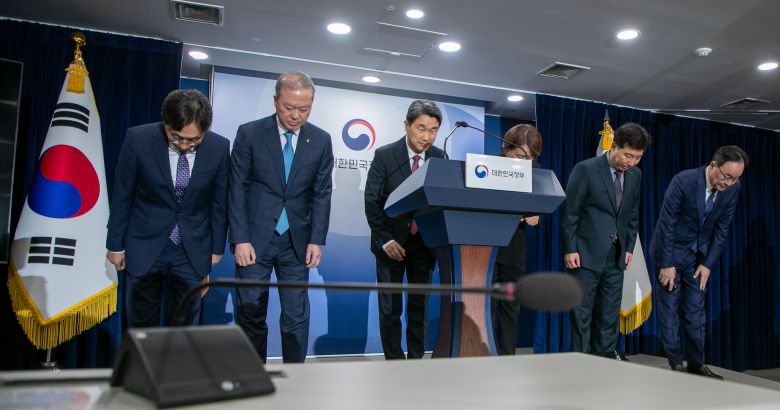4월 17일 정부서울청사에서 이주호 부총리 겸 교육부 장관(왼쪽에서 3번째) 등이 내년도 의대 모집 인원 증원 철회를 확정하는 브리핑을 열고 고개 숙여 인사하고 있다. /장련성 기자 |