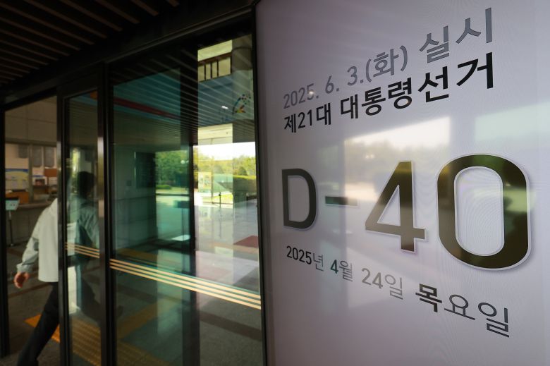 제21대 대통령 선거를 40일 앞둔 24일 과천 중앙선거관리위원회 입구에 대선까지 남은 일수가 표시돼 있다. /연합뉴스 |