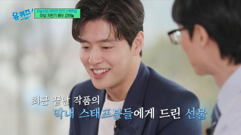 유재석이 스태프들 이름 암기를 위한 연락망 미담의 사실 여부를 묻자 강하늘은 "어릴 때 '무한도전' 보고 그럴 때부터 재석 선배님이 스태프분들을 이름으로 이야기하는 걸 보고 현장 분위기가 그려지더라. '저기'라고 부르기엔 같은 작품 하는 식구인데 정 없지 않냐"며 유재석의 영향으로 시작하게 되었음을 전했다.