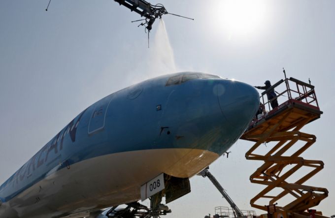 인천 중구 인천국제공항 대한항공 격납고에서 직원들이 봄을 맞아 항공기 동체를 세척하고 있다. 이날 세척한 항공기는 보잉 777-300ER 기종으로 대한항공의 새 도장이 적용된 기체다. /사진=뉴스1 |