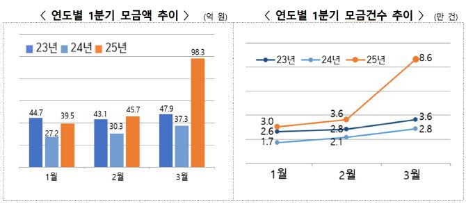 특히 기초지방자치단체 중 경북 의성군은 지난해 1분기 대비 약 22배 수준인 약 12억4000만원을 모금했으며, 이는 지난해 전체 모금액인 4억6000만원보다 2.7배 많은 수치다.