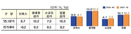 전국 오피스 공실률은 8.7%로 전 분기 대비 0.2% 줄었으며 임대가격지수는 0.44% 상승했다.