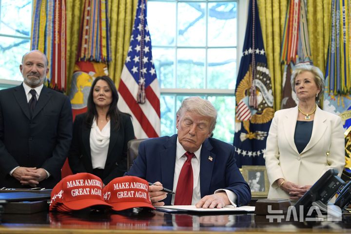 [워싱턴=AP/뉴시스] 도널드 트럼프 미국 대통령이 23일(현지 시간) 백악관 집무실에서 교육 관련 행정명령에 서명하고 있다. 트럼프 대통령은 서명식 이후 이어진 대중 관세 인하 관련 질문에 “그건 중국에 달려 있다”라며, “중국과의 협상이 진전되지 않으면 2~3주 내로 자체적인 대중 관세를 새로 적용할 것”이라고 밝혔다. 2025.04.24. |
