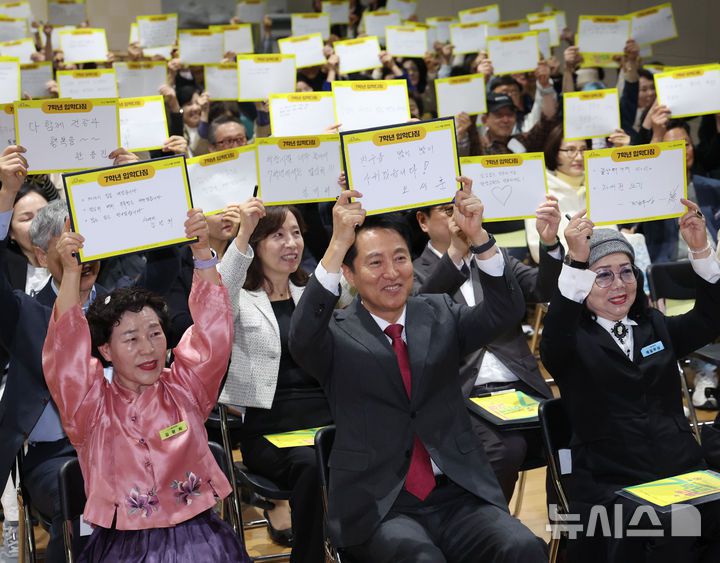 [서울=뉴시스] 조수정 기자 = 오세훈 서울시장이 24일 서울 관악구 서울시민대학 다시가는캠퍼스에서 열린 2025 서울시민대학 7학년교실 입학식에서 신입생 등과 함께 다짐의 글을 적어 들어보이고 있다. 2025.04.24. chocrystal@newsis.com