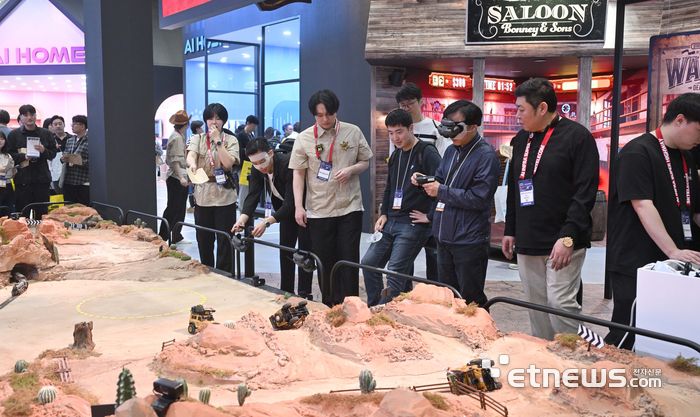 WIS 2025 SK텔레콤 부스에서 관람객들이 골드러시 관련 게임을 체험하고 있다. 박지호기자 jihopress@etnews.com |