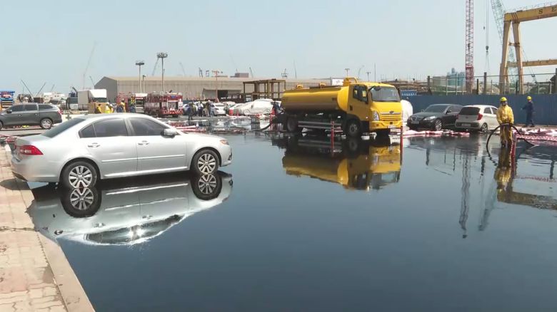 이 액체는 원유와 물이 섞여 있는 것으로, 기름 확산을 막기 위한 흰색 폼도 아스팔트 위에 어지럽게 깔려 있습니다.