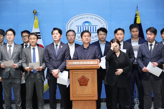 더불어민주당 전정권정치탄압대책위원회 위원들이 24일 서울 여의도 국회 소통관에서 문재인 전 대통령 기소 관련 긴급 기자회견을 하고 있다. [사진 출처 = 연합뉴스] |