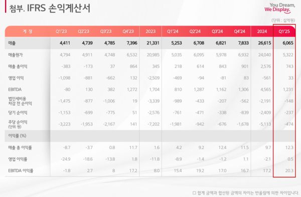 LG디스플레이는 한국채택국제회계기준(K-IFRS) 2025년 1분기 연결기준 매출액과 영업이익을 각각 6조0653억원과 335억원으로 집계했다.