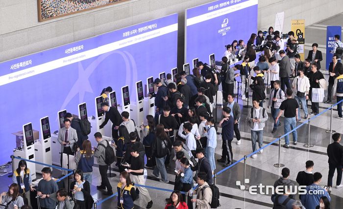 24일 WIS 2025가 열리고 있는 서울 삼성동 코엑스에서 참가자들이 입장하기 위해 줄 서 있다. 박지호기자 jihopress@etnews.com
