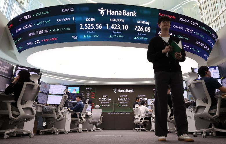 지난 23일 서울 중구 하나은행 본점 딜링룸 전광판에 종가 현황이 표시돼 있다. /뉴스1