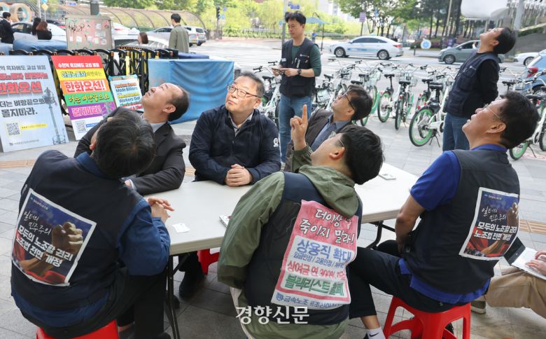 조충현 노사협력정책관(첫번째 줄 가운데) 등 고용노동부 관계자들이 24일 김형수 금속노조 거제통영고성조선하청지회장이 41일째 고공농성 중인 서울 중구 한화빌딩 앞 철탑을 찾아 금속노조 관계자들과 대화를 나누고 있다. 김 지회장은 불황기에 깎였던 상여금 회복을 요구하며 지난달 15일부터 서울 중구 한화빌딩 앞 교차로 30m 높이의 철탑 위에서 농성을 벌이고 있다. 성동훈 기자 |