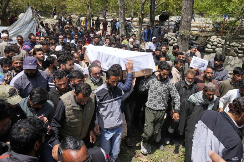 23일(현지시간) 인도·파키스탄 분쟁지역인 잠무 카슈미르 주 총격 테러 희생자 시신이 하파트나르 마을에서 운구되고 있다. AP연합뉴스