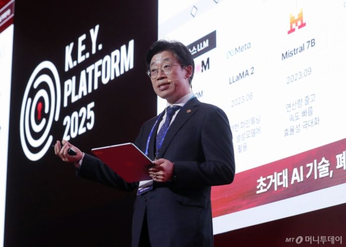 24일 서울 여의도 콘래드 호텔에서 열린 머니투데이 글로벌 콘퍼런스 '2025 키플랫폼'(K.E.Y. PLATFORM 2025)에서 기조강연자로 선 오태석 KISTEP 원장은 "생성형 AI 도입으로 공공기관이 얻을 수 있는 효과가 명백하다"며 KISTEP 자체 소형언어모델(SLM) '스파크(SPARK)' 개발 배경을 밝혔다.