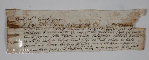 이 편지는 수신자가 '훌륭하신 셰익스피어 부인'으로 적혀 있으며 내용 중 일부분만 남아 있다.