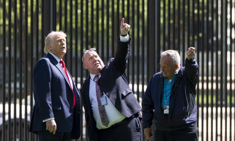 트럼프 “사비로 백악관에 대형 성조기 설치” 도널드 트럼프 미국 대통령(왼쪽)이 23일(현지시간) 워싱턴 백악관의 북쪽 정원 노스론에서 정원 관리 책임자로부터 대형 깃대 설치에 대한 설명을 듣고 있다. 트럼프 대통령은 이날 취재진에게 “백악관에 성조기를 게양할 높이 100피트(약 30m)에 달하는 두 개의 최고급 깃대를 설치할 것”이라며 설치 비용은 사비로 지불할 예정이라고 밝혔다. 그의 말대로 깃대가 설치되면 백악관 본관 옥상 외에 양쪽 정원인 사우스론, 노스론에도 대형 성조기가 게양된다. 워싱턴=AP연합뉴스