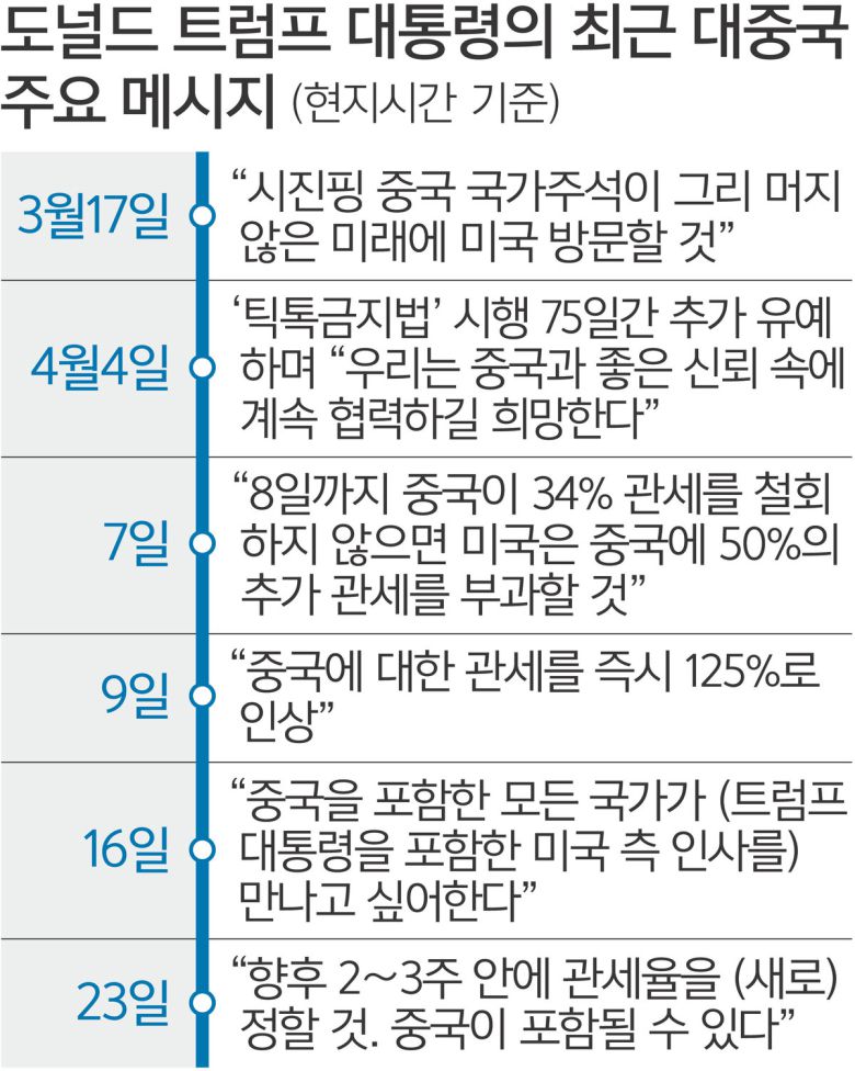 도널드 트럼프 미국 대통령이 중국과 향후 2∼3주 안에 새 관세율을 정할 것을 시사했다. 중국과 100%가 넘는 관세를 주고받으며 세계경제 불안정성을 키운 가운데 미국 시장도 주가 하락, 국채 가격 하락, 달러 하락 등으로 고전하자 연일 낙관적인 메시지를 내고 있는 것이다.