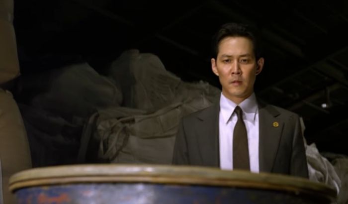 영화 신세계에서 조직폭력배 세계로 잠입한 경찰 이자성(이정재 분)이 신분이 탄로 난 동료 이신우(송지효 분)가 드럼통 안에 들어있는 모습을 바라보고 있다. [사진 = 사나이픽처스]