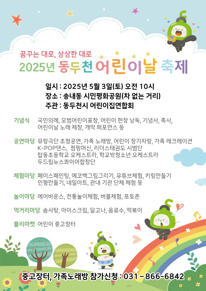 [동두천=뉴스핌]신선호 기자=동두천시는 제103회 어린이날을 맞아 오는 5월 3일 토요일 오전 10시부터 차 없는 거리로 운영되는 시민평화공원 일대에서 '2025년 꿈꾸는 대로, 상상한 대로 동두천 어린이날 축제'를 개최한다고 밝혔다.