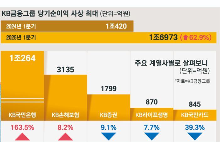 24일 KB금융은 실적 발표를 통해 올해 1분기 당기순이익(지배기업 지분 순이익 기준)이 1조6973억원을 기록해 전년 동기 대비 62.9% 늘었다고 밝혔다. 역대 1분기 기준으로는 가장 높은 수준으로, 당초 시장 전망치(1조5806억원)를 웃돈다.