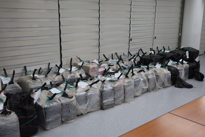 동해지방해양경찰청과 서울본부세관은 지난 2일 오전 6시 30분쯤 강릉시 옥계항에 입항해 정박 중인 선박에서 코카인 의심 물질 약 2톤 가량의 물량을 압수했다. 동해지방해양경찰청 제공 |