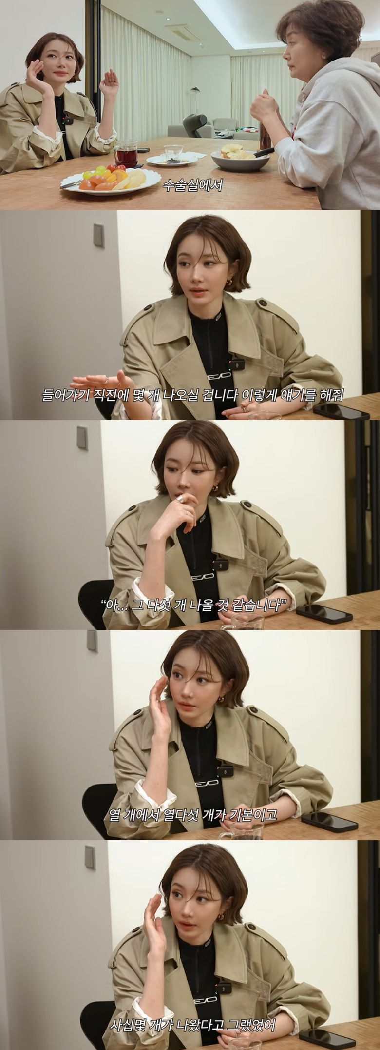 그는 "엄마한테도 안 한 얘기인데 그때 수술실에서 들어가기 직전에 '몇 개 나오실 겁니다' 라고 얘기를 해준다. 나한테 '다섯 개 나올 거 같다'라고 하더라. 보통 내가 들은 건 열 개에서 열다섯 개가 기본이고, 친한 언니는 사십몇 개가 나왔다"라고 고백했다.