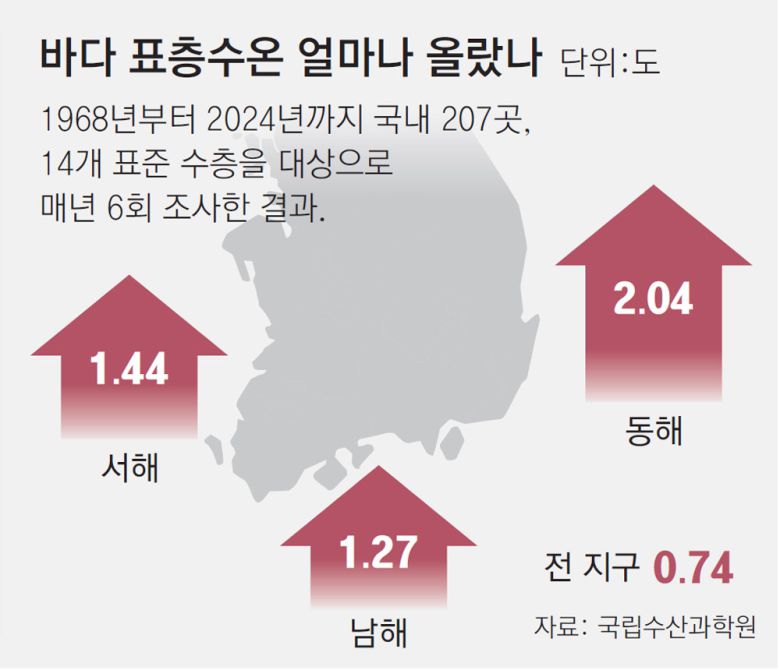 1968년 이후 지난해까지 57년간 우리나라 바다 수온이 전 지구 평균보다 2.1배 더 오른 것으로 나타났다. 지난해 고수온으로 인한 양식장 피해 규모가 역대 가장 컸는데, 이런 추세라면 앞으로 이보다 더한 피해가 발생할 수 있다는 우려가 나온다.