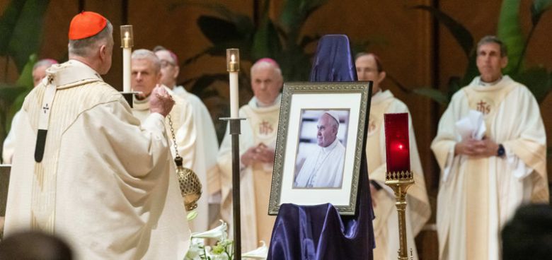 세계 각국선 추모 미사 열려 같은 날 미국 일리노이주 시카고의 성당에서도 교황의 추모 미사가 열리고 있다. 미사를 집전한 블레이스 수피치 추기경(왼쪽)은 차기 교황 후보 중 한 명이다. 시카고=AP 뉴시스