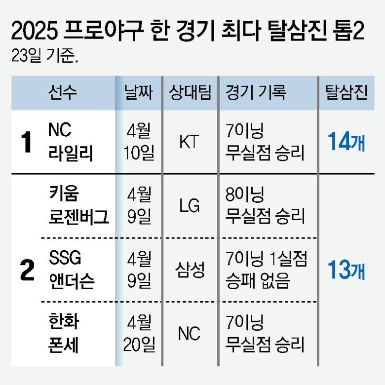 키움 로젠버그(30)와 SSG 앤더슨(31)도 이달 9일 나란히 13탈삼진 경기를 했다. 올 시즌 두 자릿수 탈삼진은 14차례 나왔는데 이 중 10번이 외국인 투수의 기록이다. 국내 투수 중에는 고영표(KT)가 2회, 소형준(KT)과 박세웅(롯데)이 1회씩 이름을 올렸다.