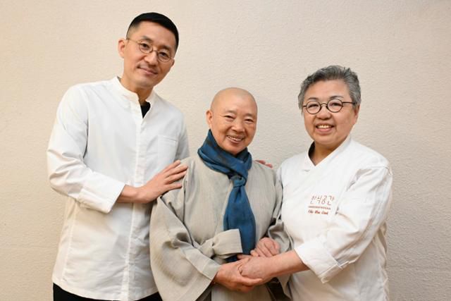 강민구(왼쪽부터) 셰프와 정관 스님, 조희숙 셰프가 9일 조 셰프가 운영하는 스튜디오 '한식공간'에서 카메라를 보면서 미소짓고 있다. 이들은 약 10년 전부터 함께 한식 공부 모임을 해온 서로의 한식 스승이자 제자다. 강예진 기자